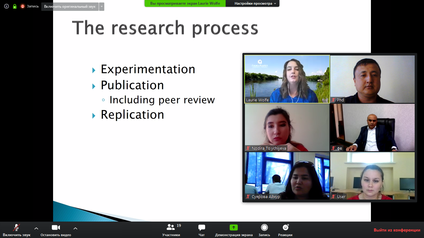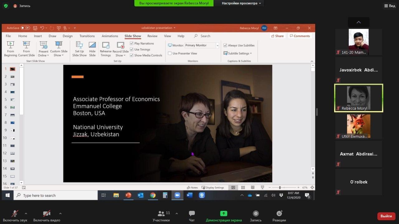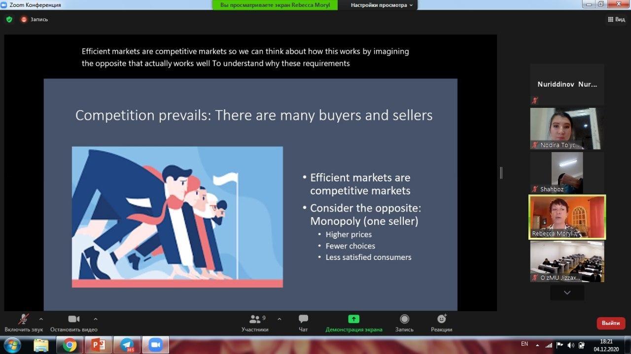 4 dekabr kuni AQSHning Boston shahridagi Emmanuyel kolleji iqtisodiyot kafedrasi dosenti Rebecca Moryl bilan “Bozorlarning samarali ishlashiga va bozor tuzilmalariga qo‘yiladigan talablar” mavzusida bir qator onlayn ma’ruzalar tashkillashtirildi.