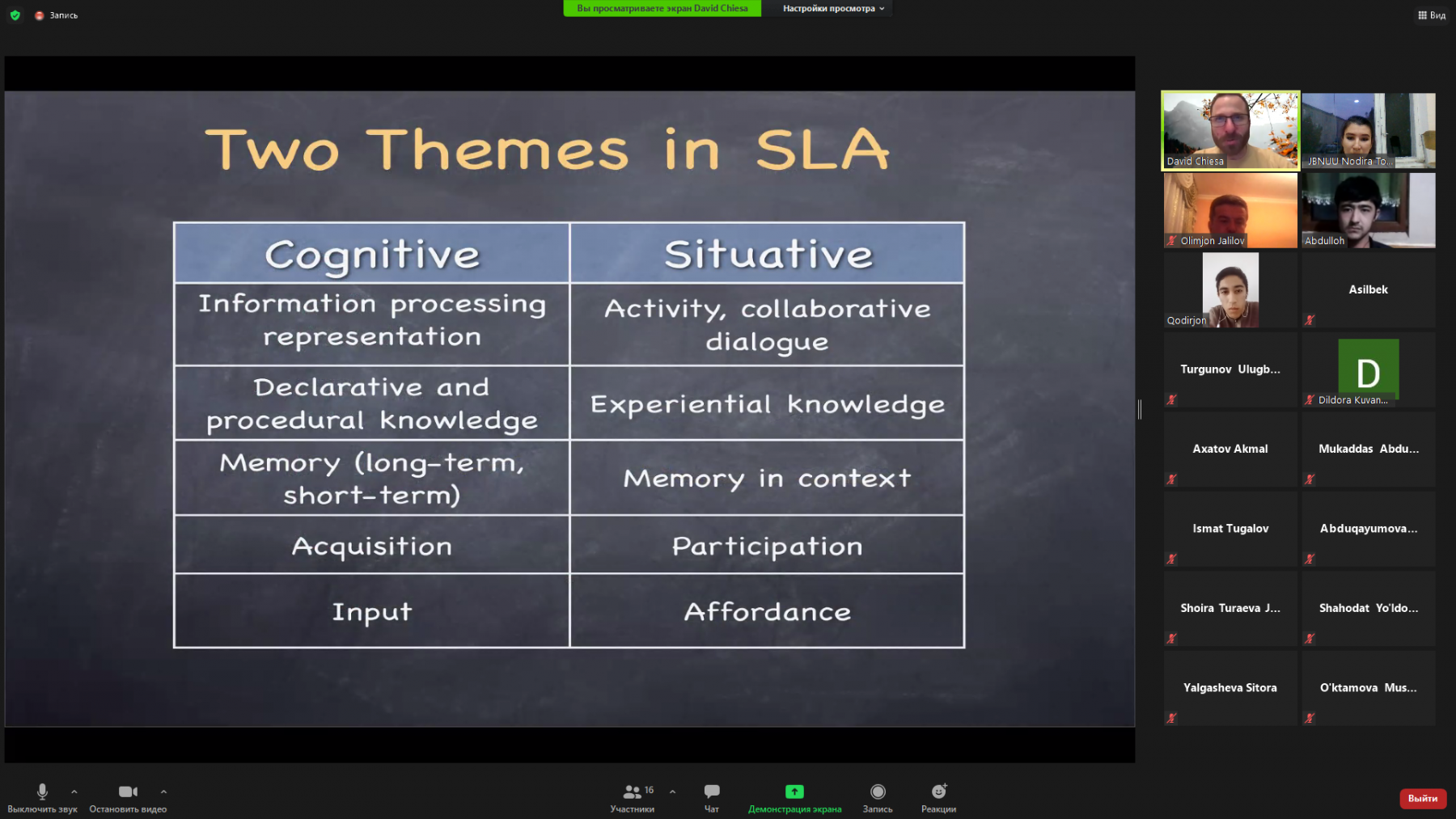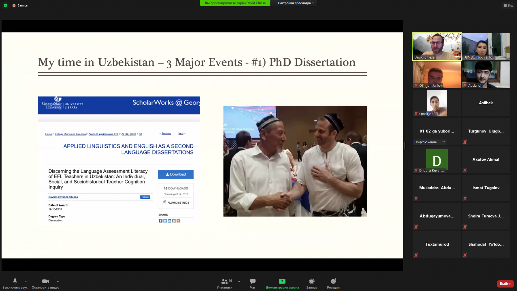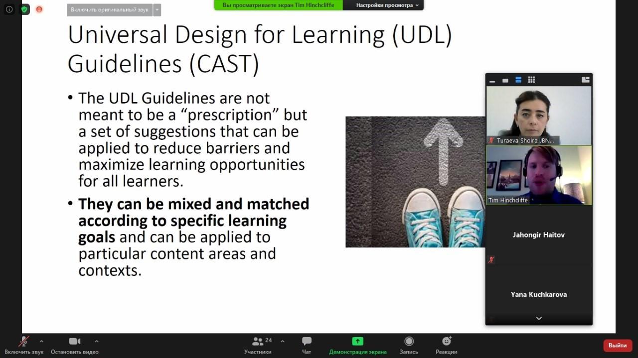 Bundan tashqari Fulbrayt dasturi doirasida 24 noyabr kuni AQSHning Jorjiya universiteti “Til va savodxonlik ta’limi” kafedrasi klinik yordamchisi, onlayn TESOL dasturi koordinatori til bo‘yicha mutaxassisi David Chiesa bilan “Onlayn (raqamli) makonda talabalarni jalb qilish strategiyasi: COVID-19 paytida tilni maqbul o‘rganishni qo‘llab-quvvatlash” mavzusida onlayn seminar tashkillashtirildi.
