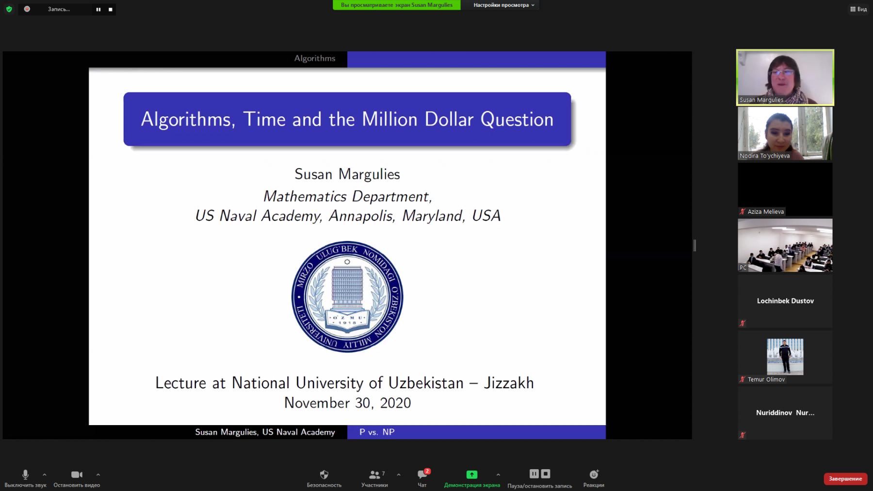 2020-yilning 1-dekabr kuni AQSHning Naval akademiyasi “Matematika bo‘limi” dosenti Susan Margulies bilan “Algoritmlar, vaqt va million dollarlik savol” mavzusida filial talabalari uchun ZOOM dasturi orqali ma'ruza tashkillashtirildi. 2013 yildan buyon Susan AQSHning Naval akademiyasi “Matematika bo‘limi” dosenti hisoblanadi. Mutaxassis matematika sohasida ko‘plab yutuqlarga erishgan va o‘zining ilmiy ishlarida matematikaning dolzarb mavzularini yoritib boradi.