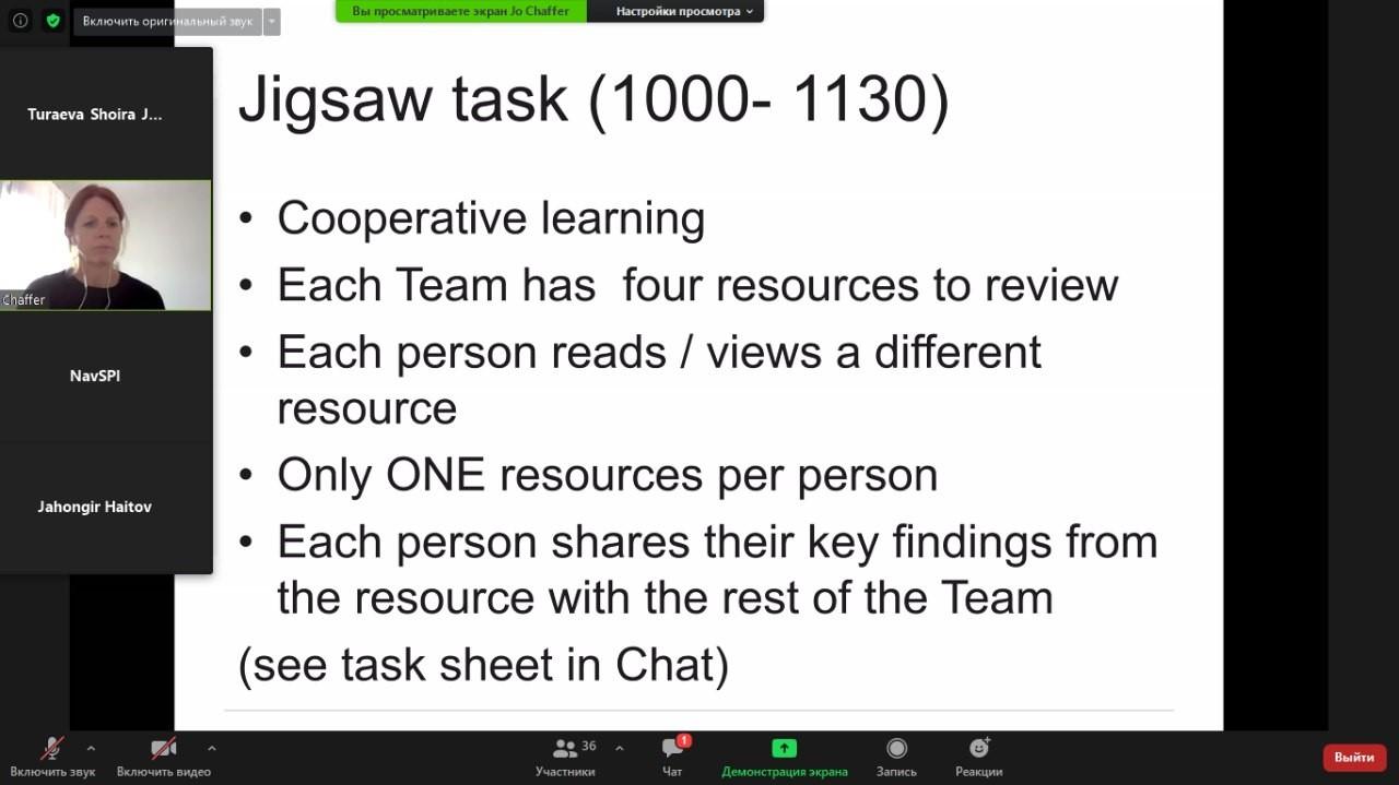 Vebinarda har bir guruh koordinatorlari loyihalari hakida hamda unda bo‘layotgan o‘zgarishlar hakida ma’lumot berib o‘tishdi. Vebinarning asosiy maqsadi har bir guruh loyihasiga yordam yoki taklif berish edi. Shuningdek 20-22 oktyabr kunlari loyiha yuzasidan LEAP 2 (ikkinchi sikl) onlayn vebinar bo‘lib o‘tdi. LEAP 2 da asosiy e’tibor quyidagilarga qaratildi: Pedagogika, sifatli o‘qitish, dastur rahbarligi, o‘quv dasturlarini ishlab chiqishni rag‘batlantirish, qiyinchiliklar va motivasiya. Vebinarda Britaniyalik mutaxassislardan J.Chaffer, Dr Patrick Baughan, Dr Kay Hack, Dr Tim Hinchliffe, Dr Kathy Wright, Britaniya Kengashining O‘zbekistondagi vakolatxonasi Shange Academy loyihasining bosh kordinatori - Indira Ihlasova hamda 9 ta jamoa ishtirok etdi. O‘zMU Jizzax filialidan guruh a’zosi sifatida Ilmiy ishlar va innovasiyalar bo‘yicha direktor o‘rinbosari A.Axatov, Xalqaro hamkorlik bo‘limi boshlig‘i N.Tuychiyeva, “O‘zbek tili va adabiyoti” kafedrasi o‘qituvchilari Sh. Turayeva va D. Quvondiqovalar ishtirok etishdi.