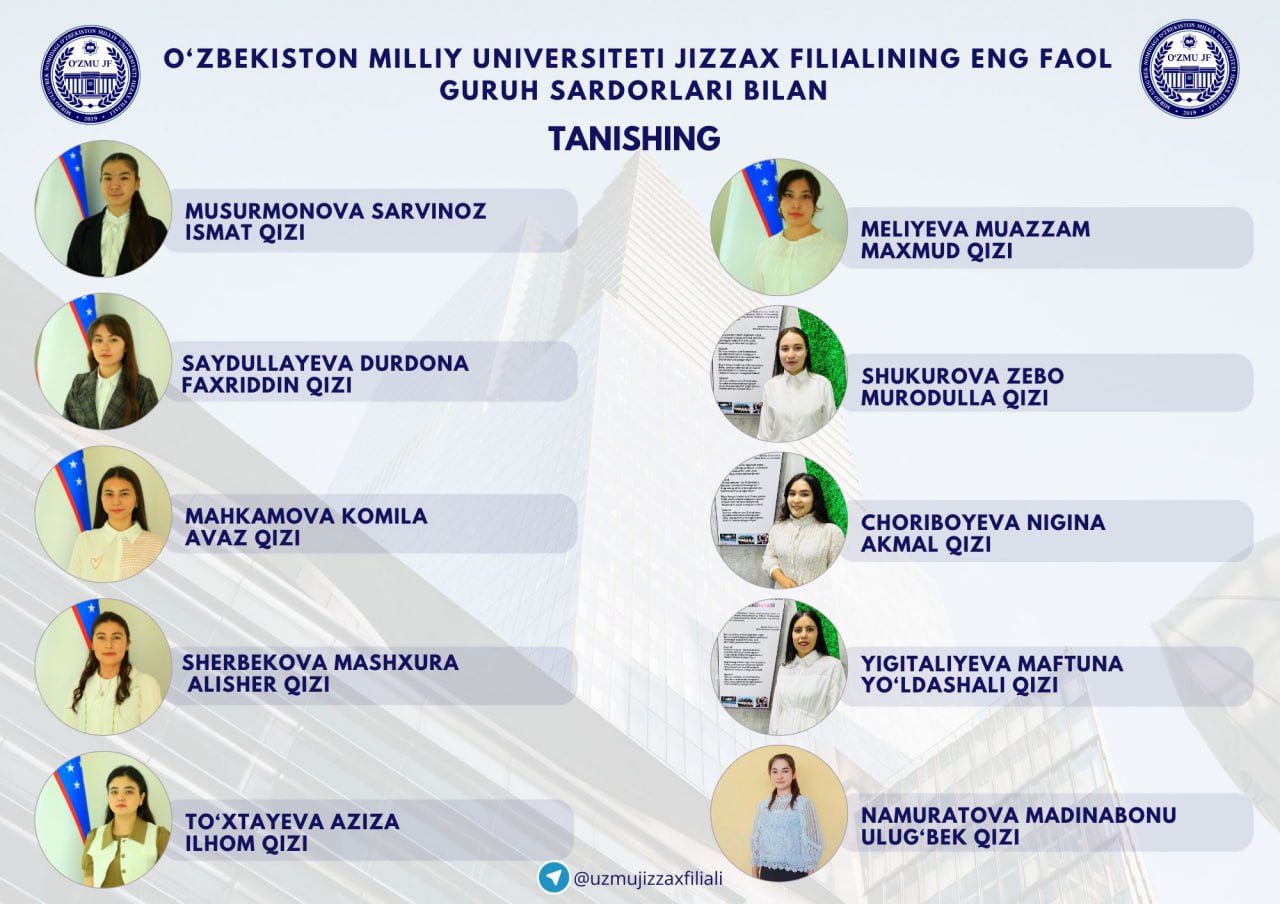 #22iyun Xabaringiz bor O‘zbekiston Milliy universiteti Jizzax filialida guruh sardorlari o'rtasida tanlov tashkil etilgan edi. Ushbu tanlovda filia.....