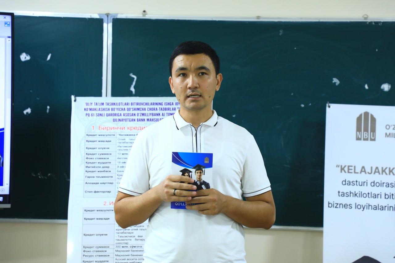 Tadbirda “O‘zmilliybank” AJ va “Kelajakka qadam” markazi mutaxassislari ishtirok etib, talabalarga bank xizmatlari va davlat dasturlari bo‘yicha batafsil ma’lumotlar berishdi.Seminar davomida talabalarga “Kelajakka qadam” dasturining imkoniyatlari, yoshlarning tadbirkorlik faoliyatini qo‘llab-quvvatlash mexanizmlari, biznes-rejalarni amalga oshirish jarayonlari haqida tushunchalar berildi.Trening yakunida esa bitiruvchi kurs talabalariga Registrator ofisi faoliyati, o‘quv jarayonidagi navbat tizimi va uning imkoniyatlari haqida ofis xodimlari tomonidan batafsil tushuntirishlar ma'lumotlar berildi. |